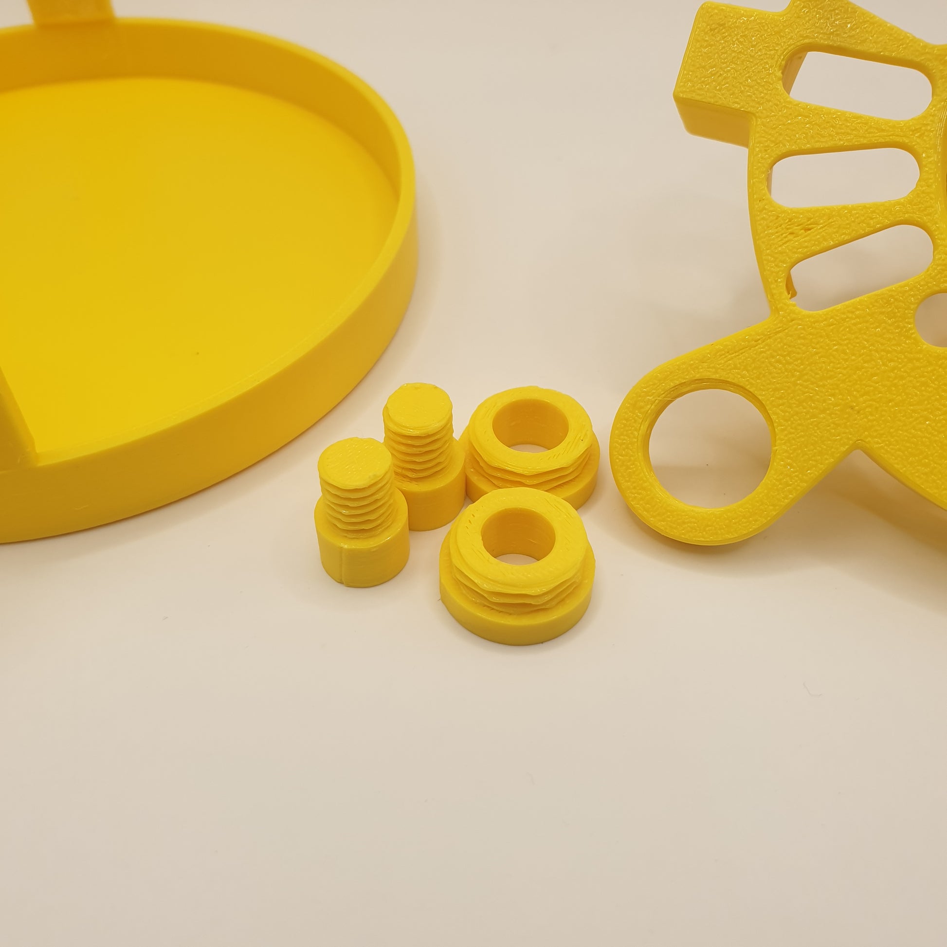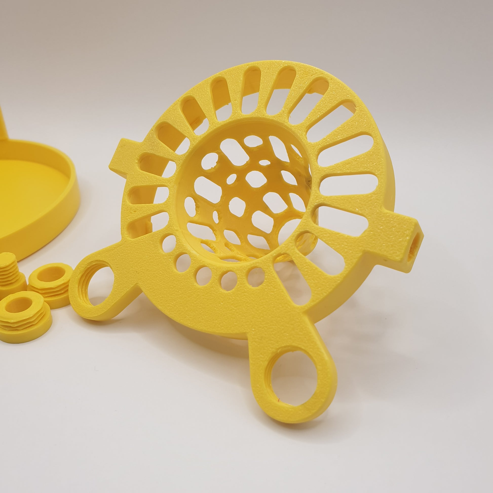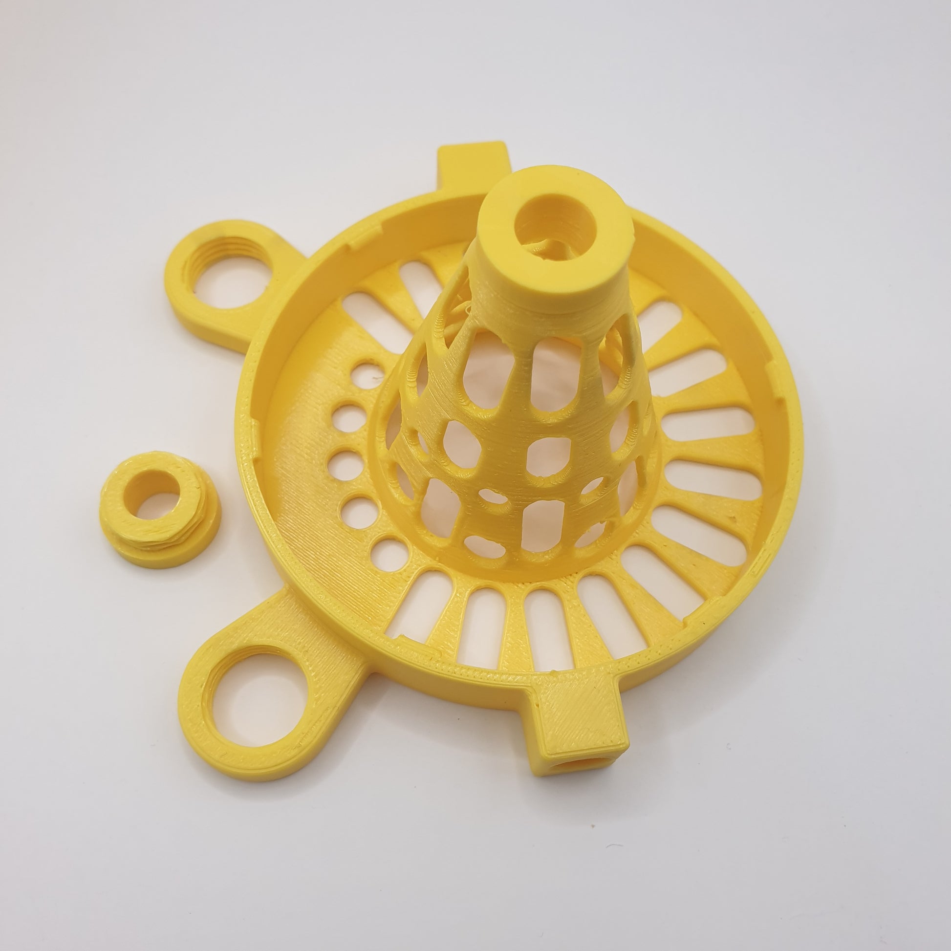 Tanto o chapéu quanto as duas peças com diâmetros diferentes são de rosca, permitindo rosquear essas peças na estrutura principal.