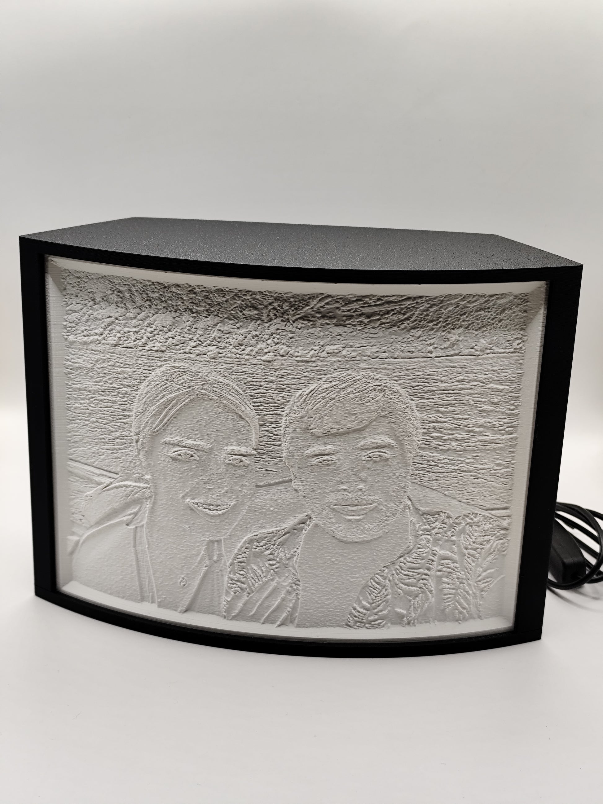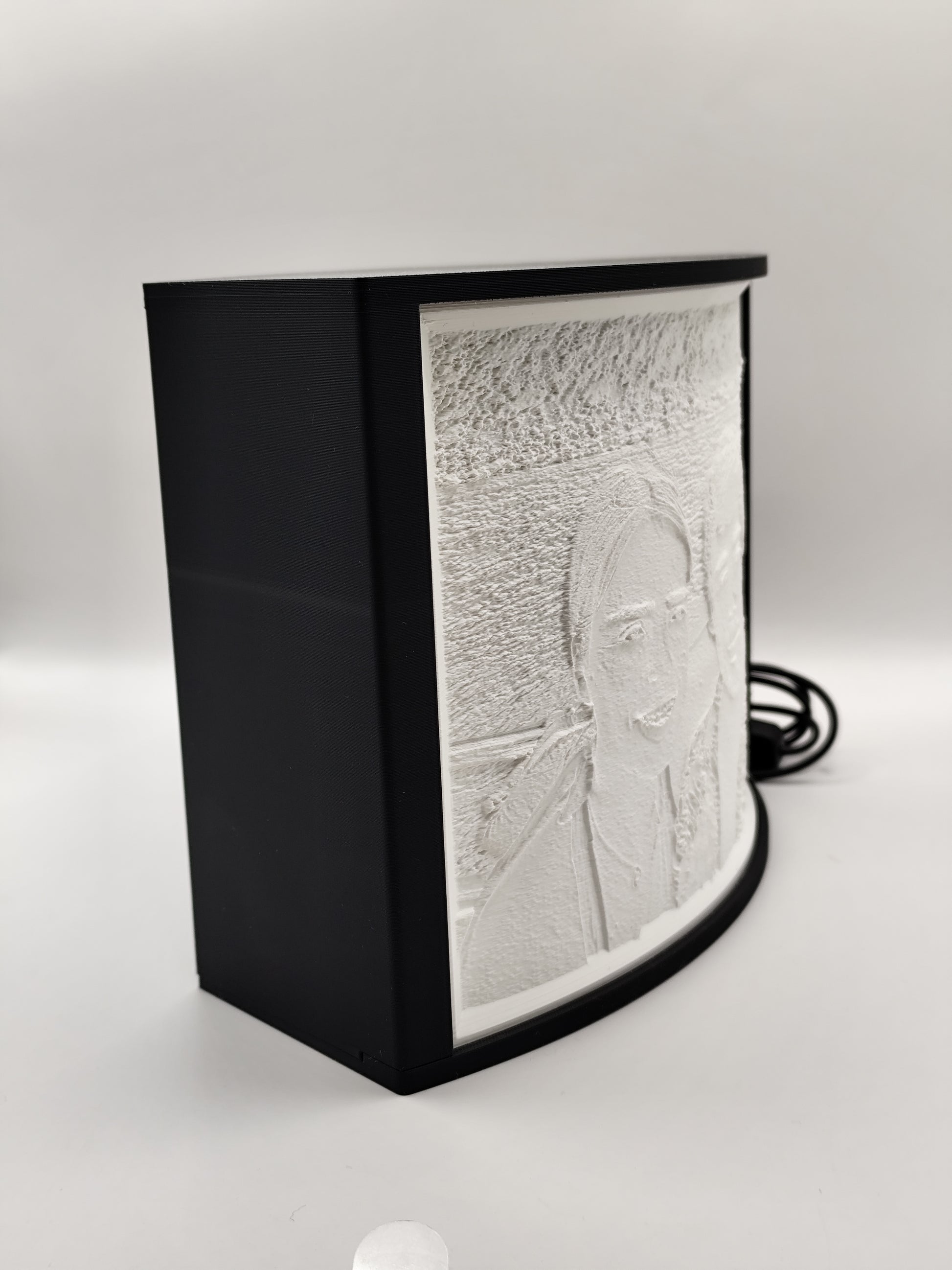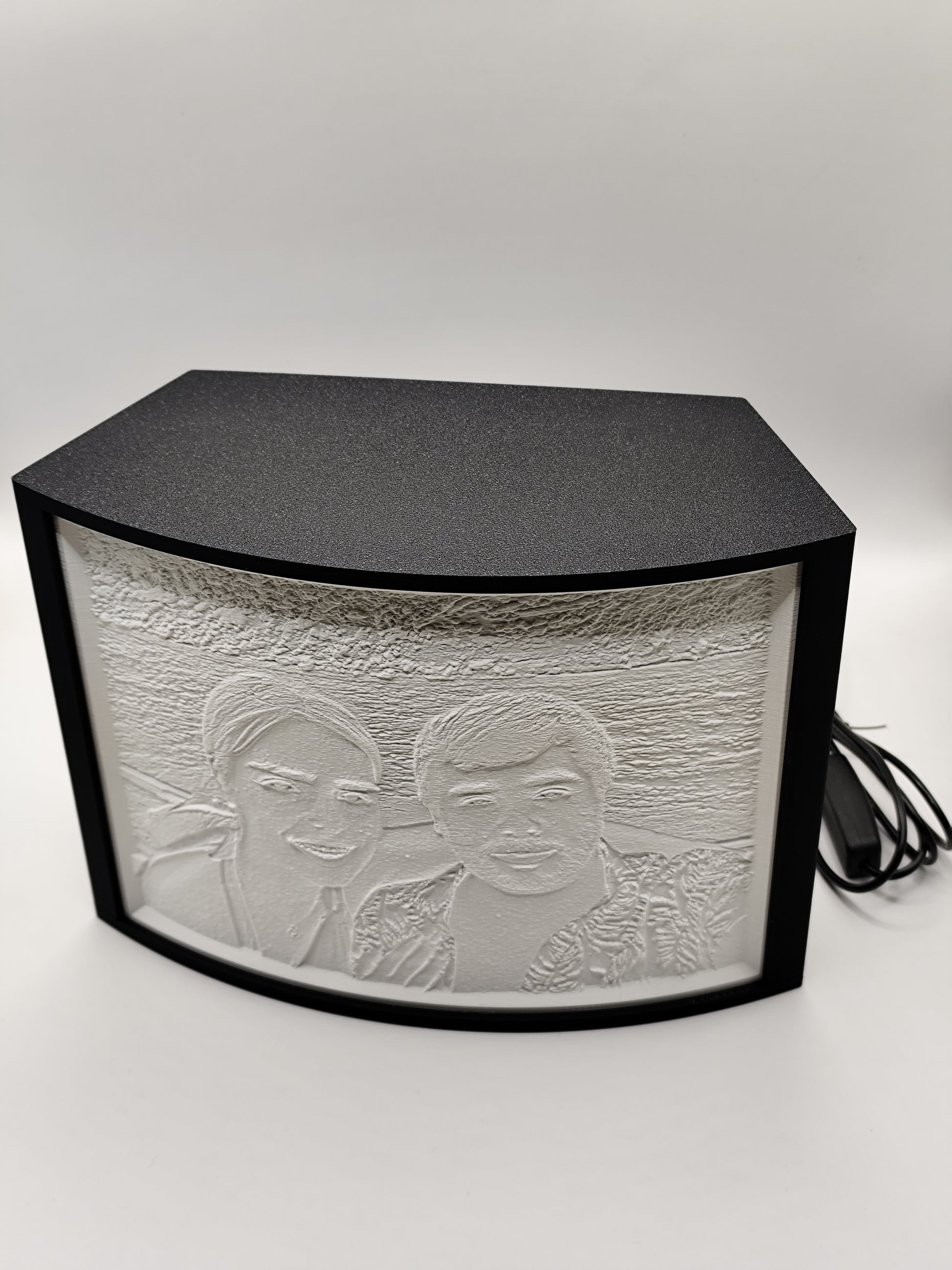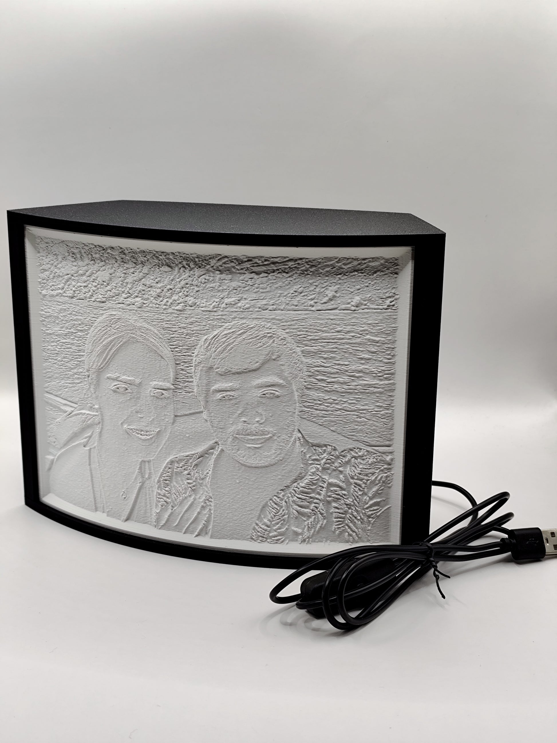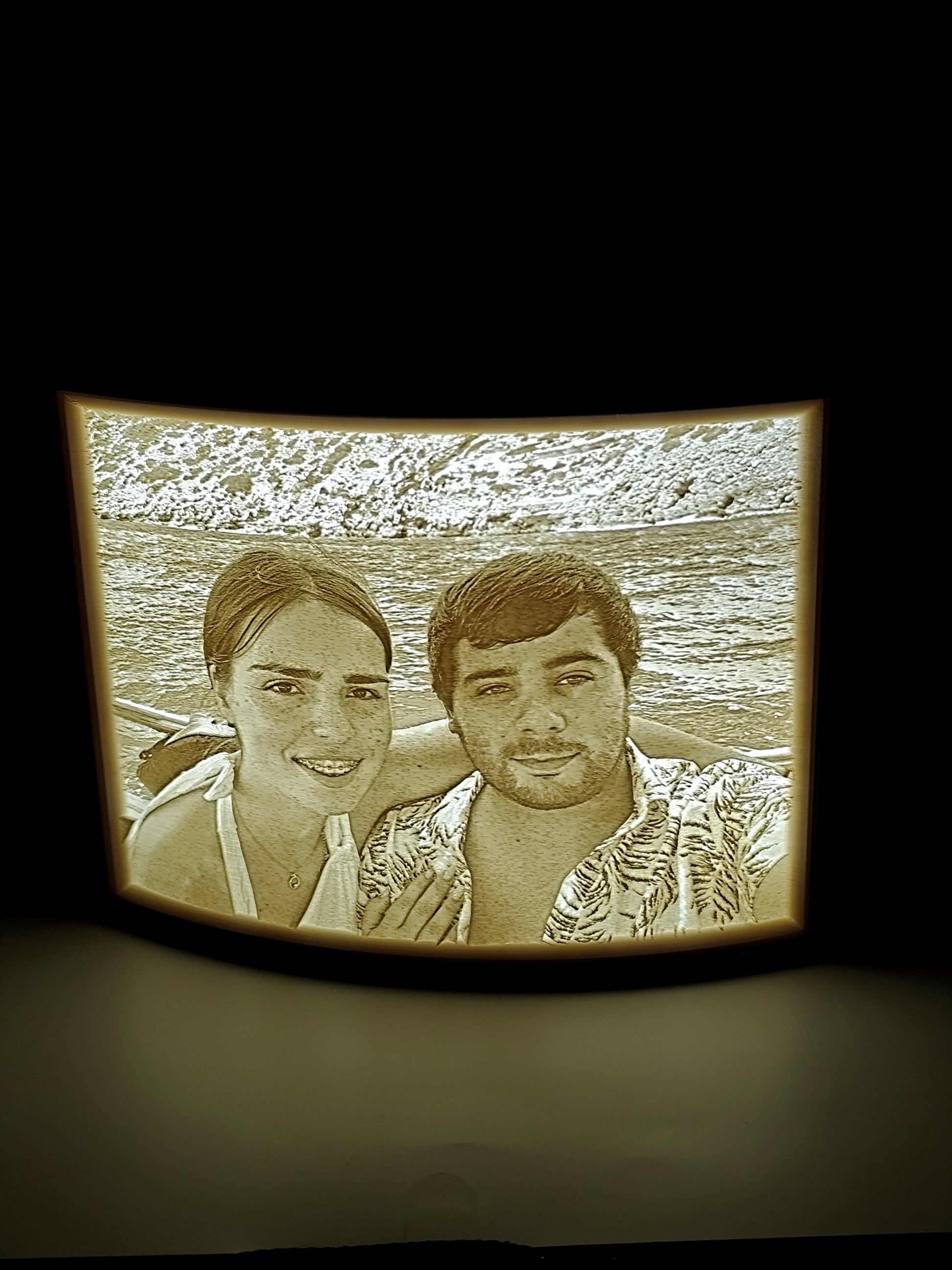 Este candeeiro elegante e moderno apresenta um formato em caixa, perfeito para personalizar com uma fotografia especial. Proporciona uma iluminação suave e aconchegante, tornando-se uma peça decorativa funcional e cheia de significado. A ligação por cabo USB permite uma fácil integração em qualquer ambiente, bastando conectá-lo a um transformador de 5V.
